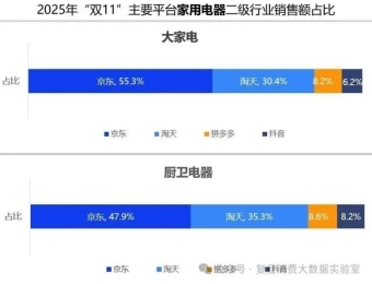 2025年双11大促落下帷幕,复旦消费大数据实验室发布的数据显示,全网零售额再创新高,达到近2.4万亿元,同比增长超10%。作为家庭计划性支出的核心品类,家电消费延续焦点地位,市场呈现出结构分化、理性升级、服务制胜等鲜明特征。 从整体市场格局来看,京东继续保持在家电领域的优势地位,销售额占比超50%,其次是淘宝天猫34.7%,拼多多7.1%,抖音6.8%。在大家电品类中京东销售额占比达55.3%,厨卫电器品类占比47.9%,也均位居行业首位。从这组数据可以看出,京东在家电领域的优势无法被撼动。