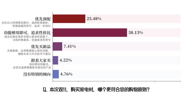 另据《2025年双11家电市场消费调研》,今年双11家电消费在用户结构上呈现出明显分化,“务实族”与“顶配族”两种截然不同的消费理念并行。其中“务实族”仍为主流,占比58.13%,他们坚持“功能够用即可”,在满足核心需求的前提下追求极致性价比。25.48%的消费者则是坚定的“顶配族”,他们认为家电大多是长周期使用产品,应在预算范围内选择配置最好、性能最强的型号,追求一步到位。